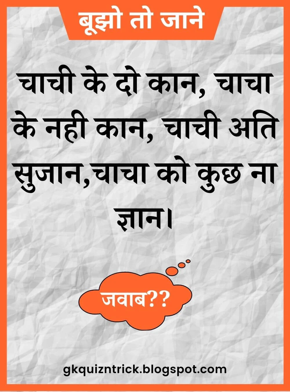 पहेली 83: चाची के दो कान, चाचा के नही कान, चाची अति सुजान,चाचा को कुछ ना ज्ञान।