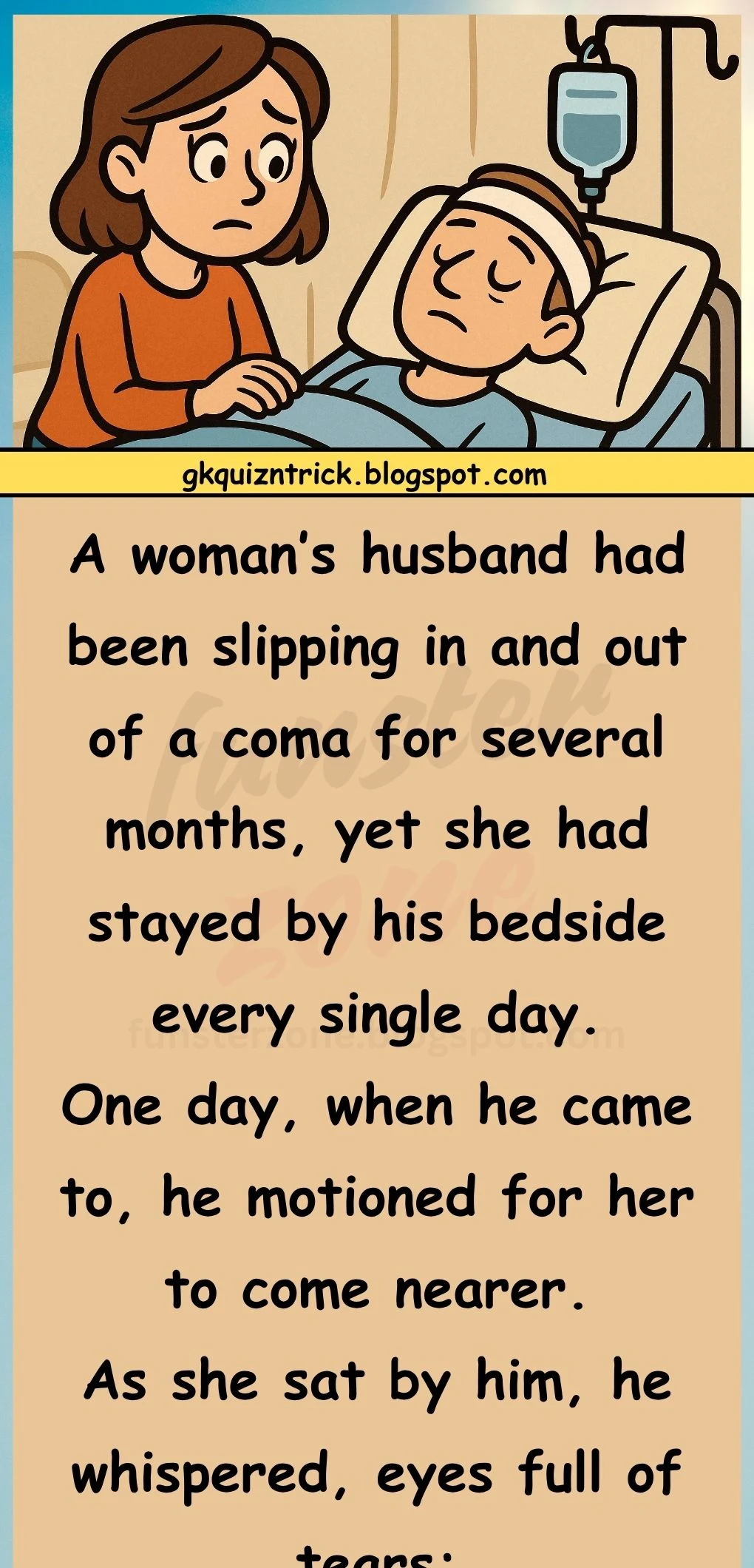 "A woman’s husband had been slipping in and out of a coma for several months, yet she had stayed by his bedside every single day.